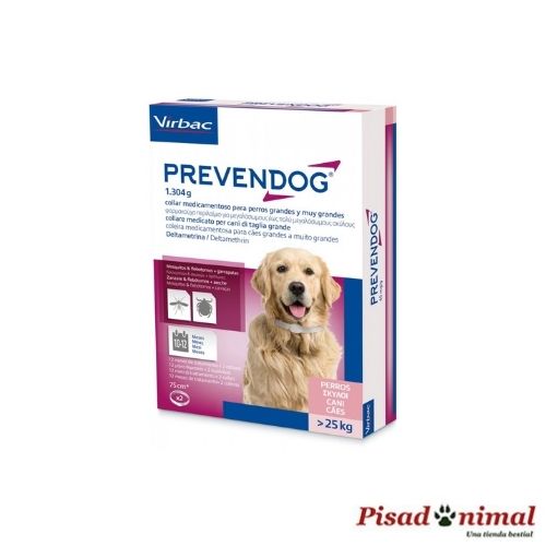 El collar antiparasitario Prevendog de Virbac es un método de protección para perros contra parásitos externos como pulgas, garrapatas y flebotomos así como las enfermedades que éstos puedan transmitir como la leishmaniosis. Doble efecto insecticida y repelente para una máxima seguridad. Presentado en 3 tallas para poder adaptarse a las razas y tamaño de cualquier perro: perros mini, perros pequeños y medianos y perros grandes y gigantes. Contiene deltametrina, un insecticida-acaricida de alta eficacia en el control de parásitos que afectan a los perros. No utilizar en cachorros de menos de 7 semanas.